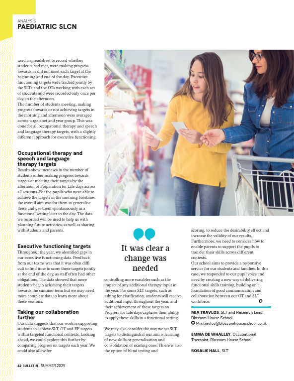 Two of our therapists, Mia Travlos (SLT) and Emma De Walley (OT) have had an article they have written about our innovative ‘Preparation for Life’ program published in The Bulletin, (the official magazine of the Royal College of Speech and Language Therapists). The program targets the daily living skills needed for future independence with students in Y8 to Y11, and is a collaborative approach jointly planned and delivered by our OTs and SLTs. Congratulations to Mia and Emma on all their hard work in getting this article into print!